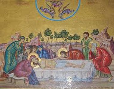 Art works above and below from Church of the Holy Sepulchre depict Jesus being prepared for burial after crucifixion.